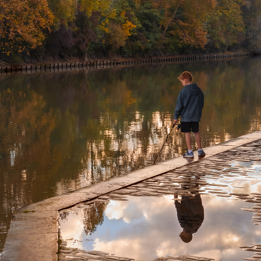 En croppant 1/5 du haut l'accent est davantage mis sur le garçon et son reflet .. ( mais on perd les beaux arbres d'automne .. ) Cornélien ..