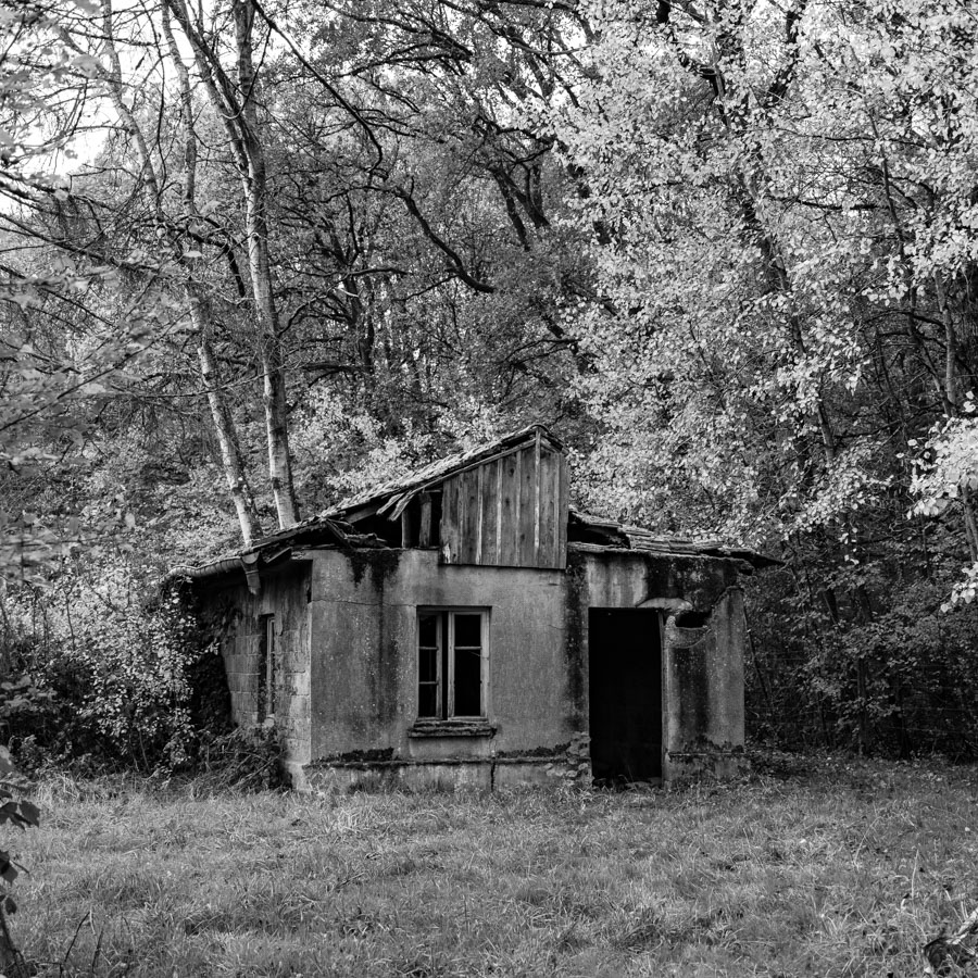 La maison reprise par la forêt dans un total abandon.