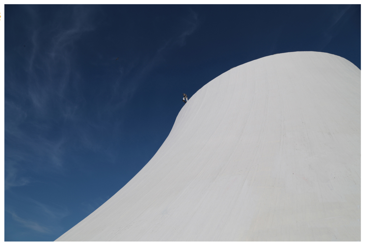 Il s'apprête à dévaler la pente, Un courageux skateur a pris place sur Le Volcan du Havre, mardi 21 juin. Le personnage, qui a de quoi surprendre les passants - ou en tout cas ceux qui lèvent les yeux ! - est en réalité une œuvre très réaliste de la nouvelle édition d'Un été au Havre, conçue par l'Américain Mark Jenkins.