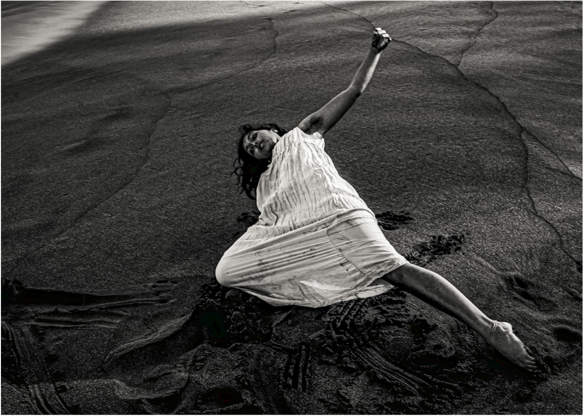 Les textures soulignent les plis de la chemise et les sillons du sable.
