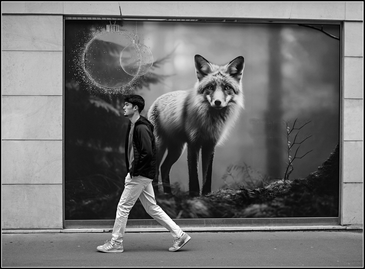 mêmes remarque qu'Apache, et je pense également que celle ci fonctionne mieux, plus facile d'imaginer un lien entre l'animal ( qui semble observer l'homme) et le passant