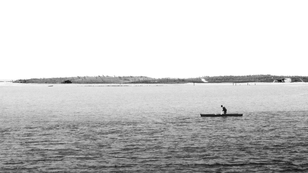 Les formes allongées qui dominent dans cette image, format, barque et ligne d'arrière-plan forment un ensemble intéressant dans une ambiance très paisible.