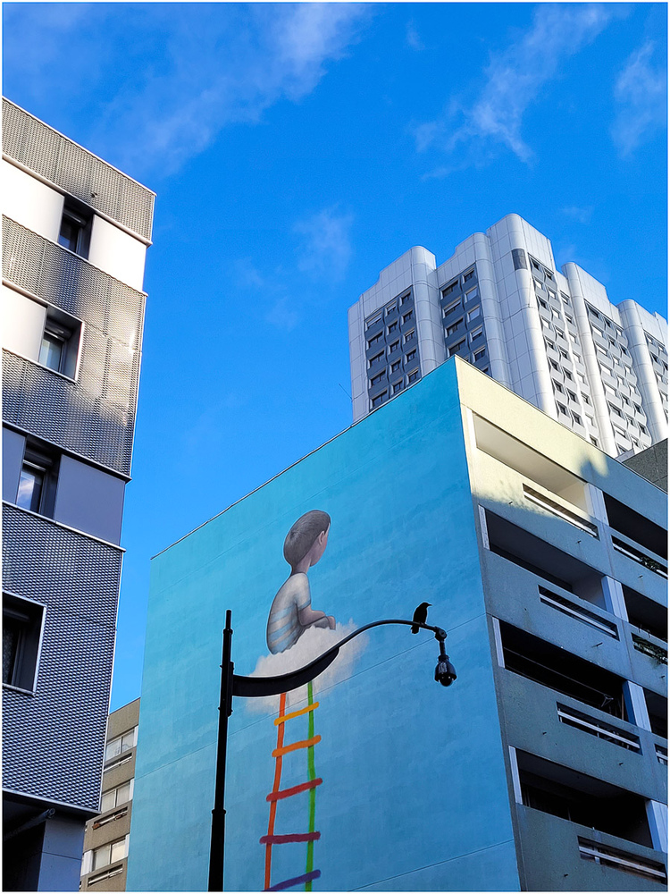 Hello, j'aime aussi le sujet, le teaitement et les couleurs du graff qui est le même bleu que le ciel... Pourquoi ne pas avoir couper plus à gauche pour faire démarrer le cadre à l'angle en bas du pilier de l'immeuble? je ne sais si je m'exprime clairement...