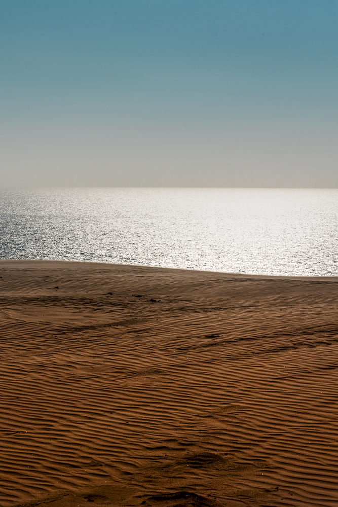 J'aime beaucoup, cette lumière ravageuse, les couleurs, chaude, froide, médium, cette composition en trois parts inégales et complémentaires, l'absence d'accessoires et le graphisme mer sable .. Superbe, je l'aurais bien vue horizontale .. Je trouve que les deux marques du bas font partie de l'image, elles l'appuie un peu vers le bas et appellent les marques du haut .. Fav ..