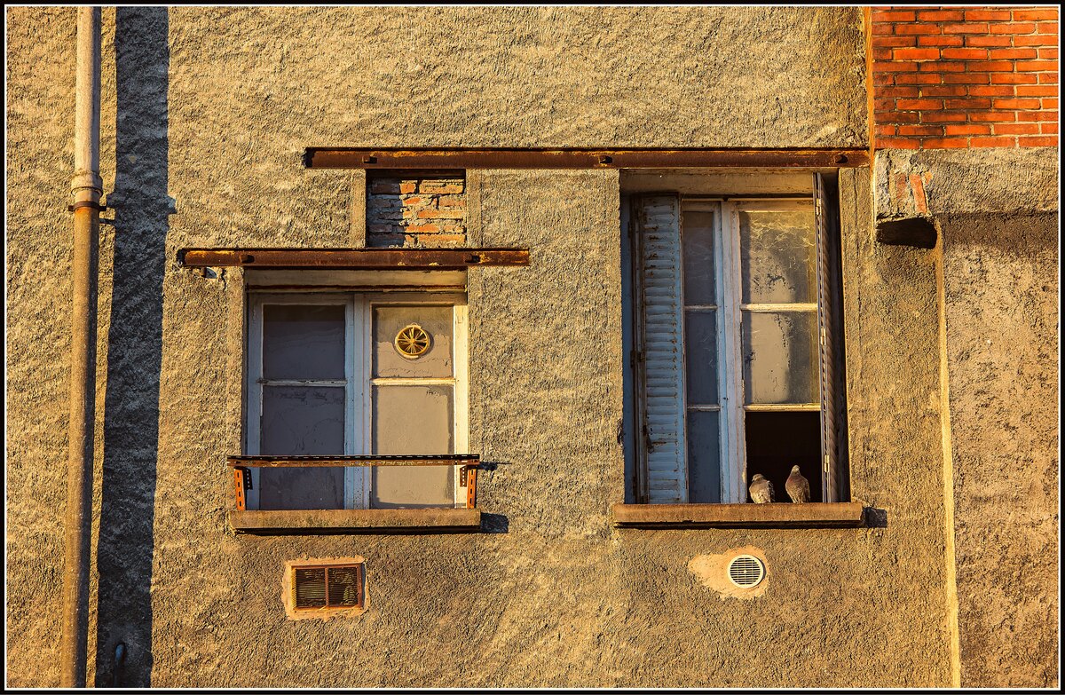 J'aime l'harmonie des couleurs à laquelle répond la dissymétrie des formes. Le regard circule aisément, il y a plein de choses à voir. La lumière chaude (c'est à dire froide) est un vrai plus qui apporte de la chaleur à ce couple de pigeons.
