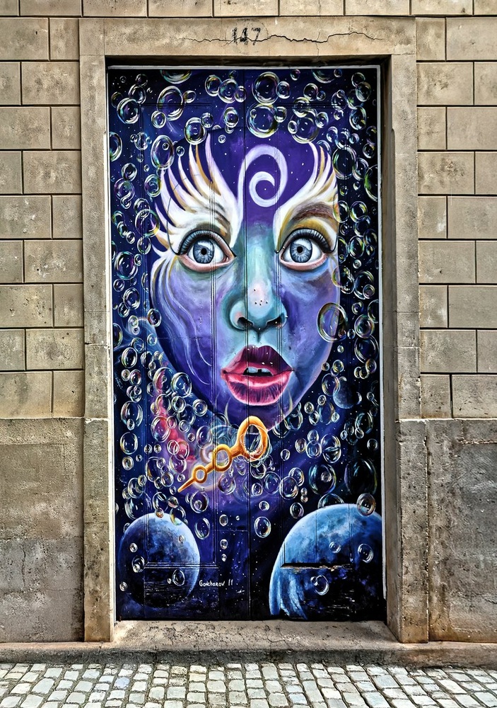 Joli travail de l'artiste '' ce qui m'intéresse également c'est le contexte '' numéro voir type d'expo urbaine? une porte vétuste de maison où le mal serait caché par la créativité d'un artiste?..