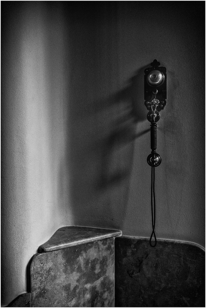 J'apprécie une fois de plus les subtilités de ce noir et blanc. Le cadrage, comme d'habitude est soignée. Mais, je trouve cette image "bancale", il manque quelque chose.Le téléphone " rétro" ne suffit pas.