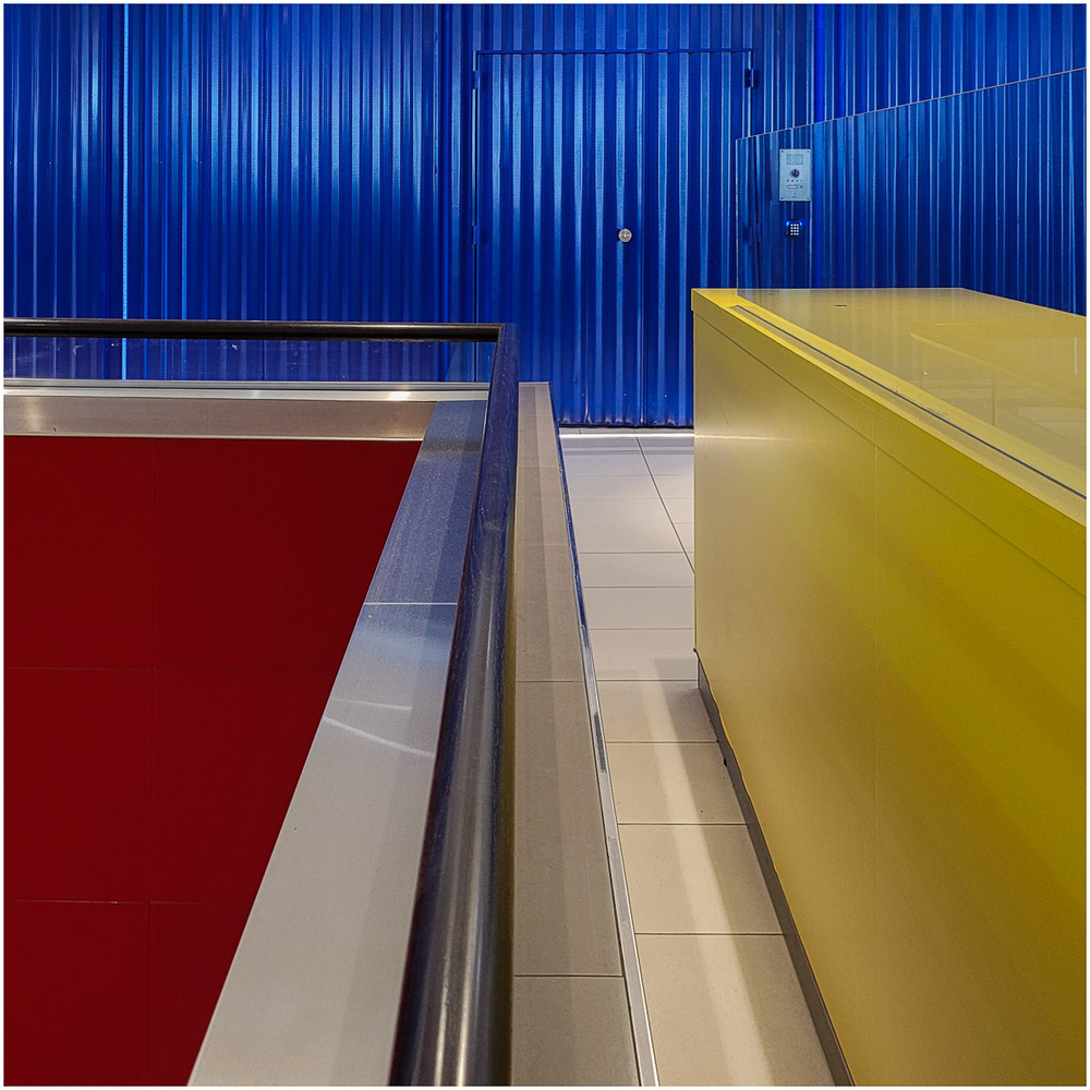 Belles gestion de la lumière et répartition des zones colorées, un espace qui de froid et fonctionnel devient graphique et ludique.