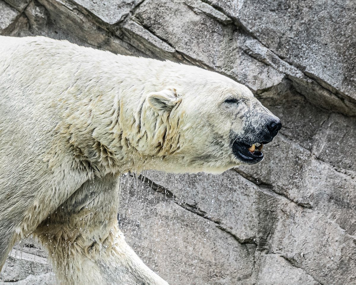 J'ai essayé de flouter l'arrière plan, mais je perd l'effet des gouttes d'eau qui pour la pdv ont une grande importance. Entre l'ours et moi il y a une épaisse vitre qui retient son bassin d'eau (800 000 litres) dans lequel il évolue. C'est dire l'épaisseur de la séparation. La plateforme sur laquelle il marche doit faire +/- 3 mètres de large donc il était près du mur. Ce qui explique malheureusement la netteté de ce dernier.