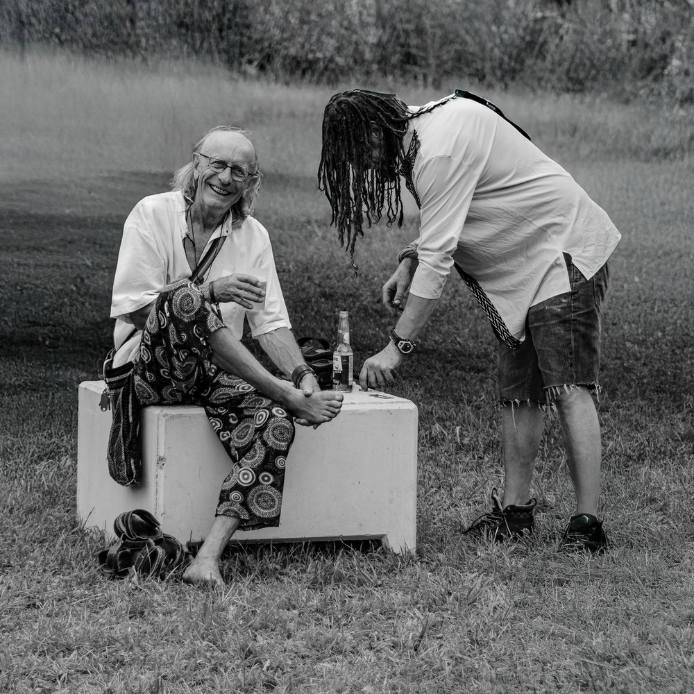 Dans un premier temps j'aime bien, j'y vois un petit coin tranquille à l'écart de la "fête", l'homme de gauche ( je veux dire à gauche de l'image ^^&apos sourit chaleureusement au photographe, j'imagine qu'ils se connaissent. C'est bien le sourire de cet homme qui porte le gros de l'image. Après ce qui me contrarie, c'est que l'autre personne ne soit pas du tout à son avantage, dos vouté, le visage caché par ses cheveux, contrairement au premier, il ne semble pas être conscient qu'une photo est prise et pourtant le voilà immortalisé, enfermé dans le stéréotype du "punk à chien", bientôt une bière à la main et une roulée dans l'autre... Et pourtant, j'imagine bien qu'il n'est pas que ça, mais le regard et le choix du photographe le ramène encore à cet unique aspect . Autrement dit, j'ai le sentiment que la photo à été prise uniquement en se préoccupant du premier sans se soucier du second alors même que les deux étaient probablement entrain de discuter avant que la photo ne les séparent.