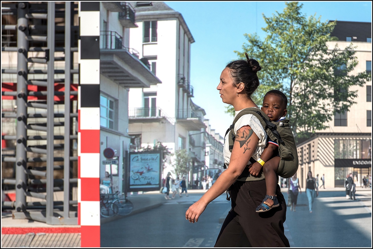 Une ville pensée pour ses habitants, vivante, accessible, sensible et la présence du couple mère-enfant au premier plan renforce cette idée de lien, de quotidien, de tendresse au milieu d'un espace urbain animé.