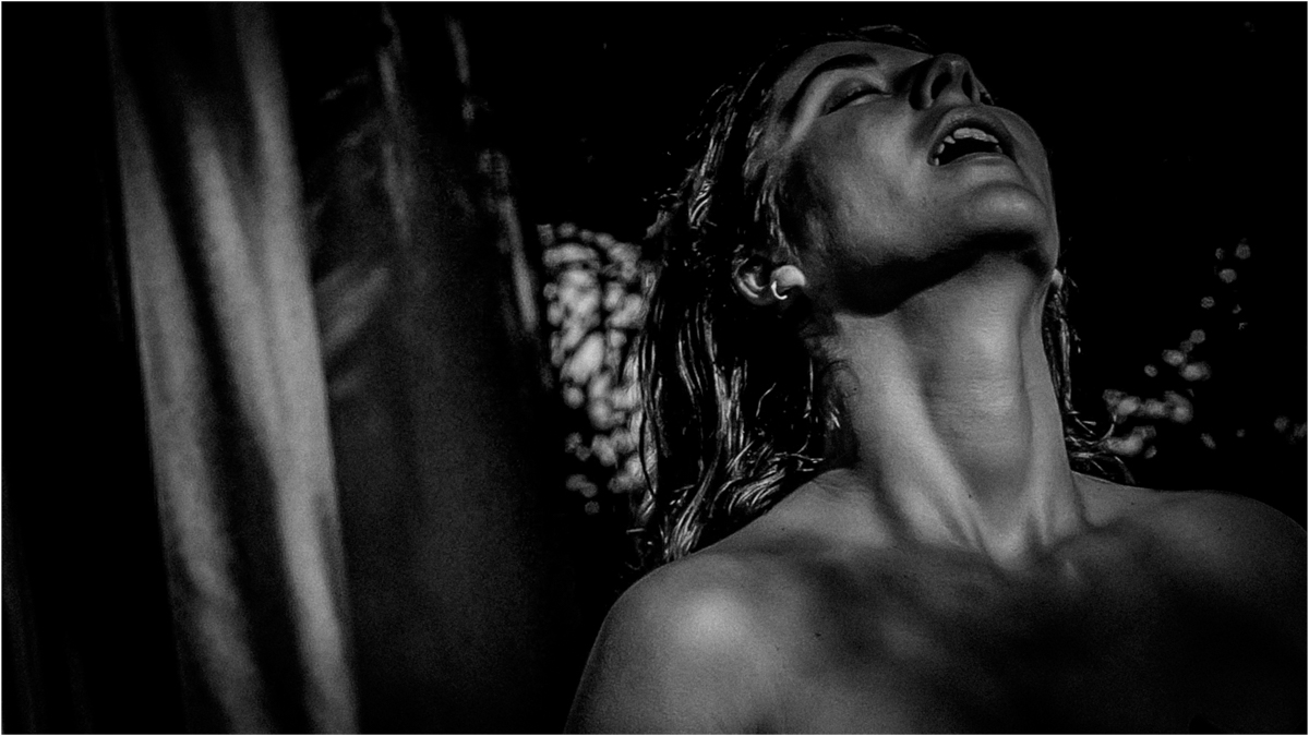 Expression forte de son visage qui exprime comme une libération, cadrage dynamique et original, N&B dense...