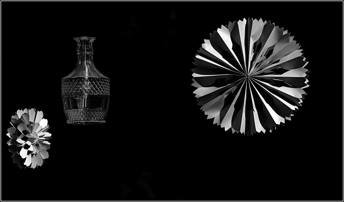 En l'état originel, les 2 origamis et le flacon sont suspendus par des ficelles assez inesthétiques et la vitrine est polluée par des centaines de poussières et leurs ombres sur les 3 objets.