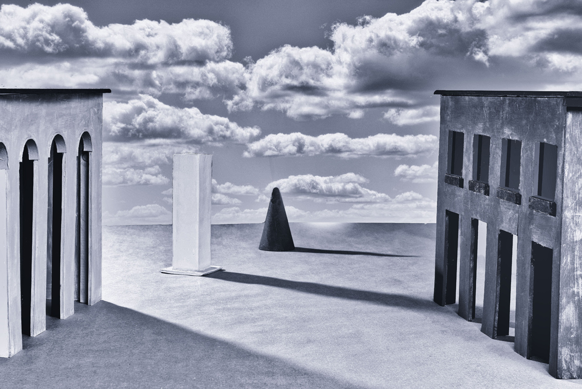 La juxtaposition d'un ciel photographique au reste traité comme un dessin naïf à insinuation surréaliste saute aux yeux ..