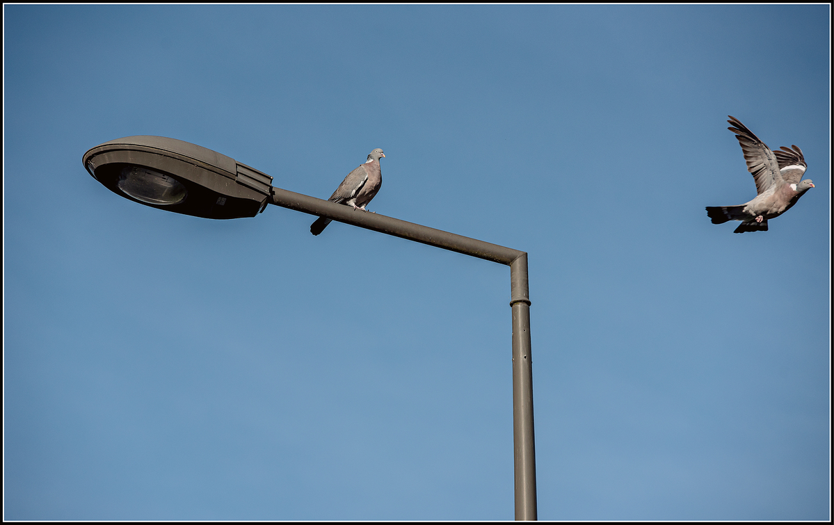 Le pigeons confortablement installé et la lampe font plutôt bon ménage (graphisme/ sujet)