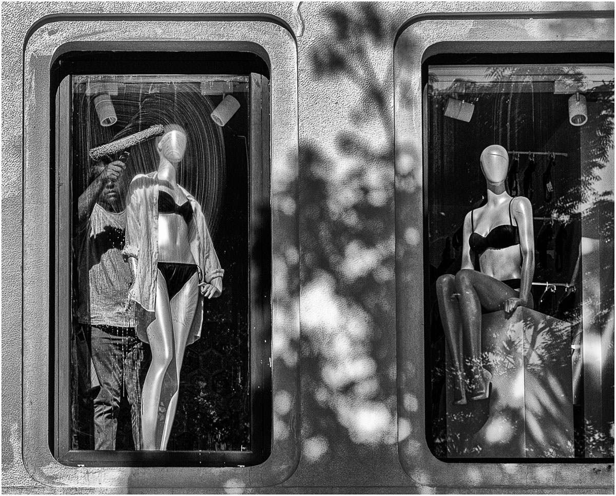 Le NetB lumineux sert bien la photo, notamment les reflets sur les mannequins, la scène est presque cocasse car on se dit que le laveur de vitre aurait pu se permettre de pousser le mannequin pour être plus à l'aise, dommage que tu n'ais pas pu proposer une vraie symétrie et que la fenêtre de droite soit coupée