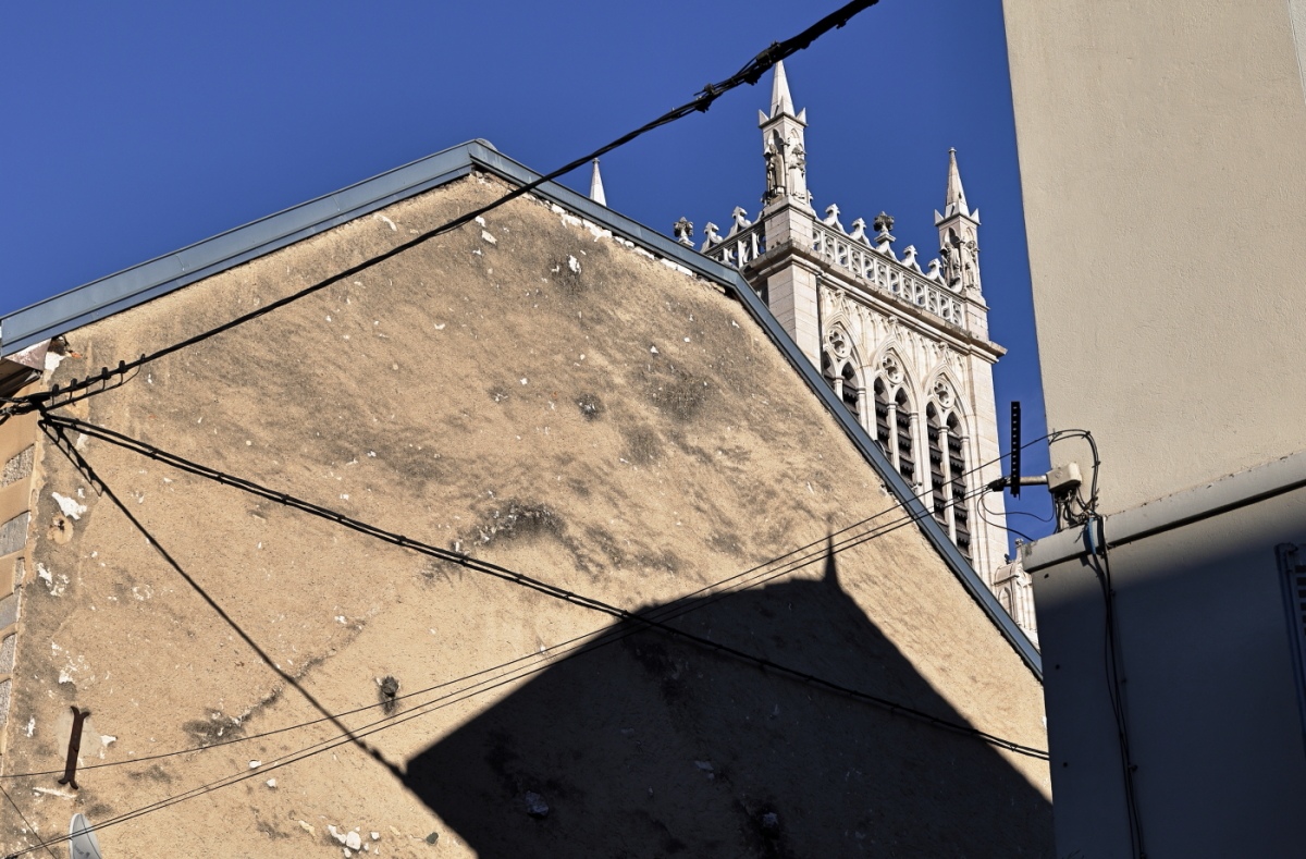 J'aime bien l'ombre qui rappelle le toit avec la pointe du clocher, sur laquelle elle se projette