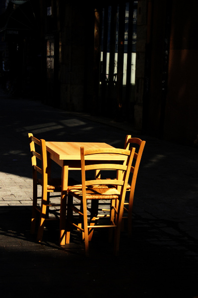 ou un cadrage beucoup plus large pour voir un peu plus de la rue et donc de l'ambiance avec la table et cette lumière ... l'idée est vraiment bien à voir aussi peut être en nb