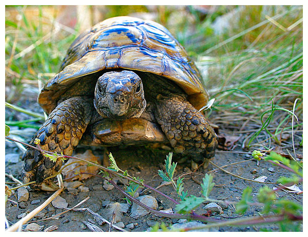 Géniale cette photo jean-claude...J'aime bien les couleurs de la carapace... J'aurais peut être enlevé le brin d'herbe sur la patte... Elle a un air bien sympatique
