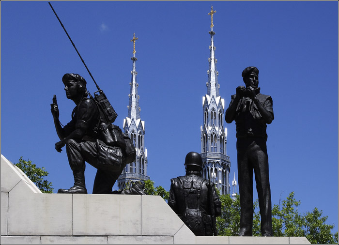j'aime bien le titre qui colle bien à la photo...je regarde et je me demmande s'il y a un angle à prendre pour ne pas couper le clocher de gauche....ou déplacer la statue
