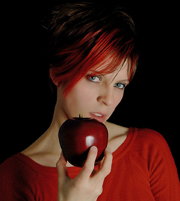 Cette photo me plait vraiment beaucoup ! La prépondérance rouge pull / pomme / cheveux donne une véritable harmonie, et contrastée par la couleur des yeux et l'intensité du regard.