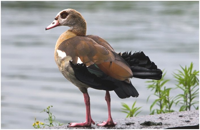 Belle ouette d'Egypte, très bien prise. Un fond flou qui n'attire pas l'oeil et quelques pointes vertes des végétaux font une très belle photo.