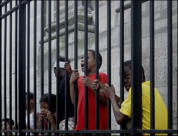 Des enfant qui regardent, fascinés, un spectacle, qui a lieu derrière la grille. Le petit garçon en rouge chante à tue tête...