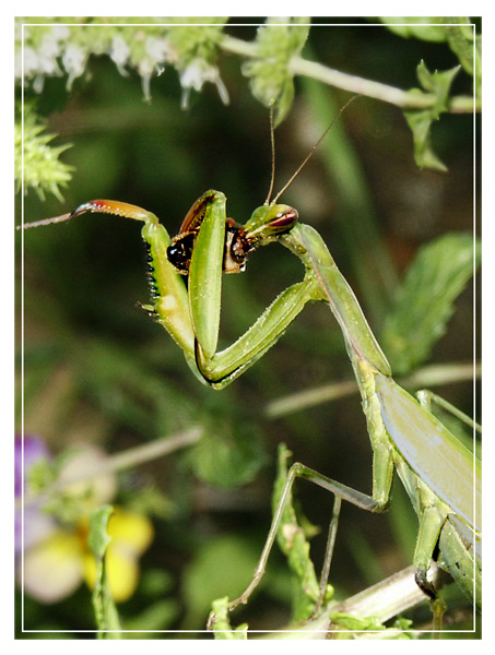 En fait elle mangeait une abeille ce soir dans mon jardin. Et comme il n'y avait plus assez de lumière j'ai mis un coup de flash qui a tout cramé et malgré photoshop il y a pas mal de séquelles sur l'expo. Dès que je me serais mis au reflex numérique je m'appliquerai plus...