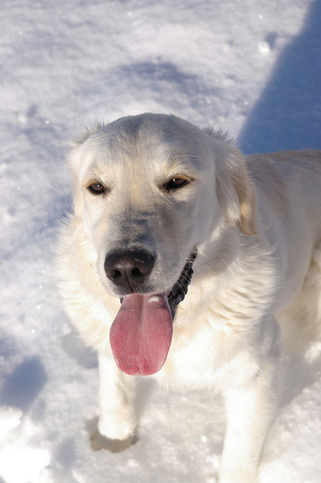 Photo sympa, mais certains points me gênent personnellement : l'ombre sur la neige derrière le chien; la prise de vue faite de trop haut, je me serais peut-être baissé un peu pour être plus à la hauteur du chien; et l'ensemble trop blanc (mais il n'est pas forcément facile de prendre un chien blanc sur un fond neigeux). C'est un golden?