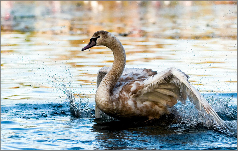 Voici une excellente photo de cygne, avec un très beau dynamisme, une netteté à toute épreuve et un super piqué. De plus, la grande vitesse d'exposition a très bien figé les gouttelettes d'eaux et les mouvements aquatiques près des ailes.