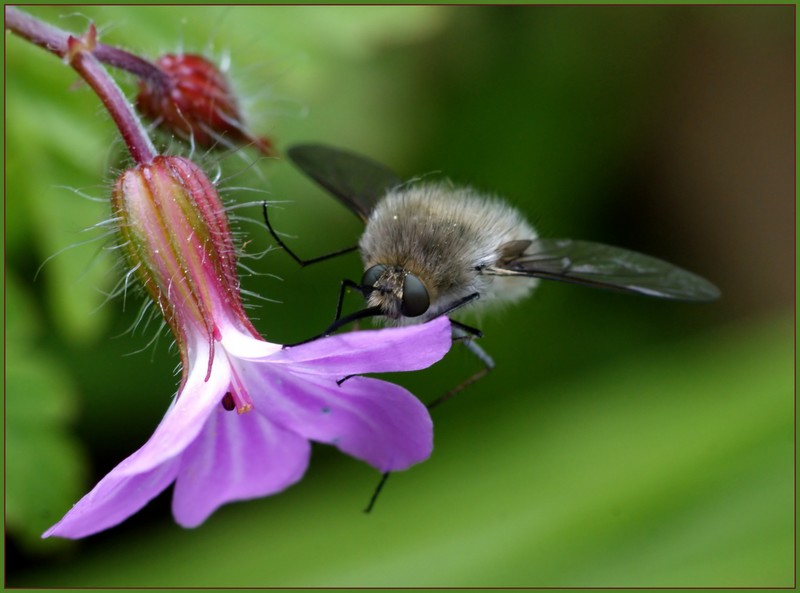 La bestiole en question c'est un bombyle. Très rapide en vol, il lui arrive quelque fois de faire du sur place pendant un court instant, ce qui permet, parfois, de réussir à le prendre.