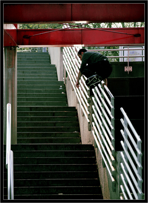 Tout d'abord le cadrage ne convient pas. Les deux bandes rouges attirent trop le regard. J'aurais carrément coupé en dessous, mais bon, dans ce cas le personnage se retrouverait trop bord cadre... pas facile. L'idéal aurait été de cadrer de façon à ne voir que les marches et la rampe, et rien d'extérieur.
