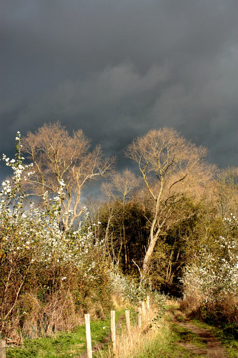 Pour un ciel menaçant je trouve qu'il y a trop de place pour les arbres. C'est du 50/50. Et je trouve dommage également le point de vue, les piquets au milieu n'amènent rien. Peut-être qu'un décalage à droite du photographe et monter un peu la visée ? Mais bon c'est facile à dire...