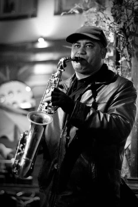 Moi je suis mitigée sur l'arrière-plan parce que c'est vrai qu'il est visible, mais d'un autre côté il plante bien le décor, pour ce jazzman de rue. Je pense que c'est important qu'on le situe bien dans la rue, habillé chaudement parce qu'il pèle ... Ca va dans le sens du titre.