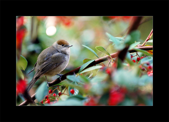 J'aime beaucoup, l'oiseau est bien placé dans la photo, et la branche en diagonale donne de l'effet dans le flou rougeatre environnant, elle est très belle,!