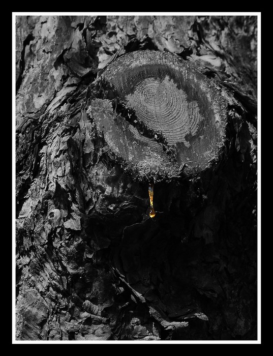 C'est vrai qu'un plus gros plan donnerait sans doute quelque chose de meilleur en donnant plus d'importance à cette belle goutte de résine... Personnellement, je couperais en haut et à droite, sans hésiter à mordre sur le rond de coupe de la branche...