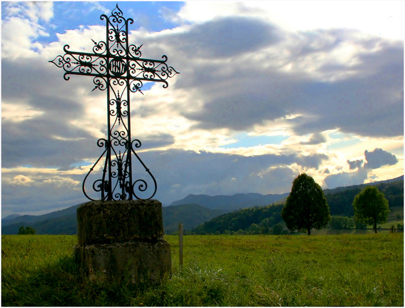 La lumière et le ciel font superbement bien ressortir la croix! Très joli ambiance et très joli paysage.