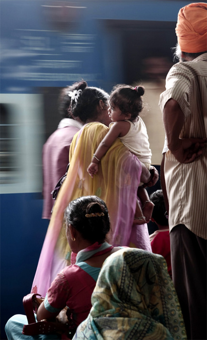 La gare bondée de Delhi en Inde. Je suis assis comme tout le monde sur mes bagages, j'attends mon train. Il fait chaud et je suis fatigué par tout le bruit qu'il y a ici. Un train arrive, j'ai juste le temps de me lever, de sortir rapidement mon appareil, d'essayer de fermer l'image correctement. Je déclenche. Dommage que la petite fille dans les bras de sa maman ne me regardait pas à ce moment là...