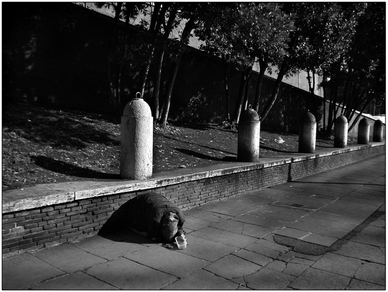 Le regard ne s'arrête pas sur l'être humain recroquevillé au pied du muret, il suit l'alignement des bornes et sort de la photo.