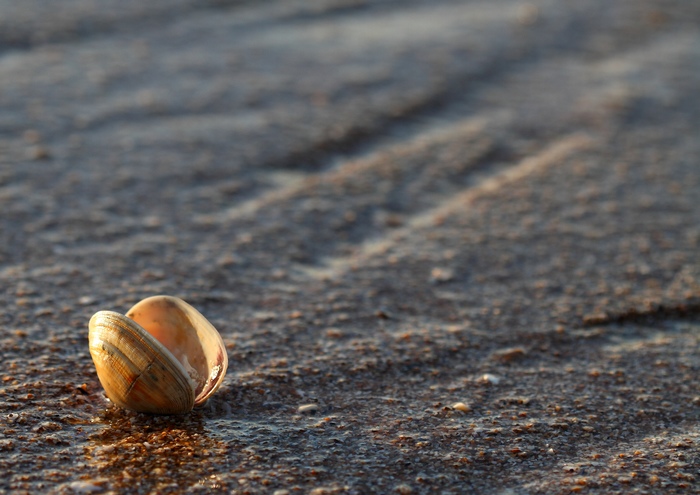 j'aime bien le cadrage, avec les lignes dans le sable qui partent en éventail, et le coquillage dans le coin (peut-être un poil trop dans le coin), la PDC courte, j'aime moins la partie un peu crammée sur la coquille