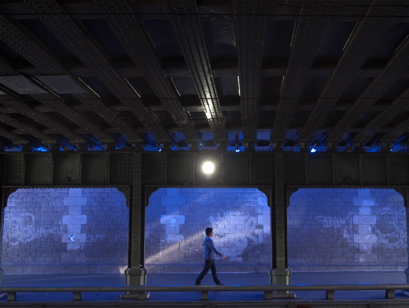 J'aime bien l'idée, la couleur du pull rappel les tons de l'éclairage. Après, sur le cadrage, je trouve dommage que ce ne soit pas tout à fais symétrique (notamment sur les poutres supérieures du pont). Je pense que c'est la dessus que t'essayais de jouer et cette petite excentration fait perdre quelque chose à la photo. Il aurait fallu se déplacer plus à gauche, à mon avis.