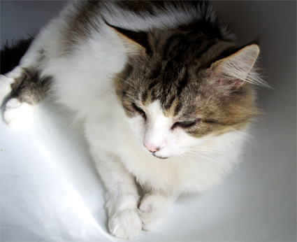 Cependant c'est une tres belle photo, j'aime bien l'angle de prise de vue, la position du chat et le fait que tout soit blanc autour, il manque de peu pour qu'elle soit superbe, a mon gout
