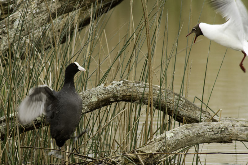 Dommage pour la Mouette rieuse qui, à mon avis vient essayer de s'approprier peut -être les ouefs du Foulque macroule qui semble être sur un nid...