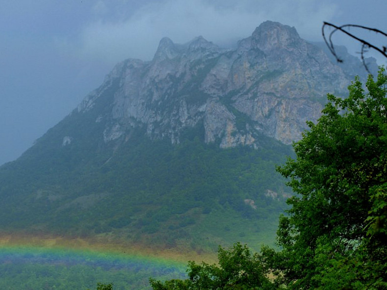 Le pic du Bugarach dans l'Aude culmine a 1230 m.Sur ces flancs beaucoup de légendes se complaisent et provoquent l'actualité du village du même nom a ses pieds. Ce jour-là, au cours d'une randonnée, cet arc-en-ciel au pied du pic m'étonne par une position vraiment inhabituelle. Sur cette vue, en effet, ce phénomène somme toute courant se situe au niveau du sol. Étonnant non?