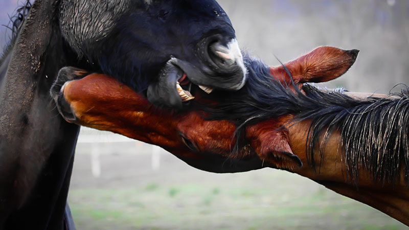 sympa cet échange et ce cadrage je suis juste un peu gênée par la couleur très rouge du cheval bai
