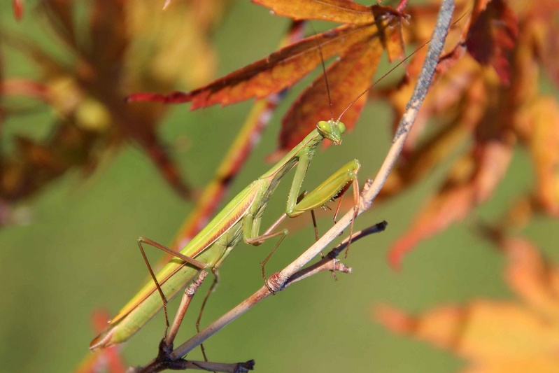 Vu la taille d'une mante, il est difficile de la photographier dans son ensemble tout en évitant le cadrage centré. Ici j'aurais coupé à gauche pour faire un carré.