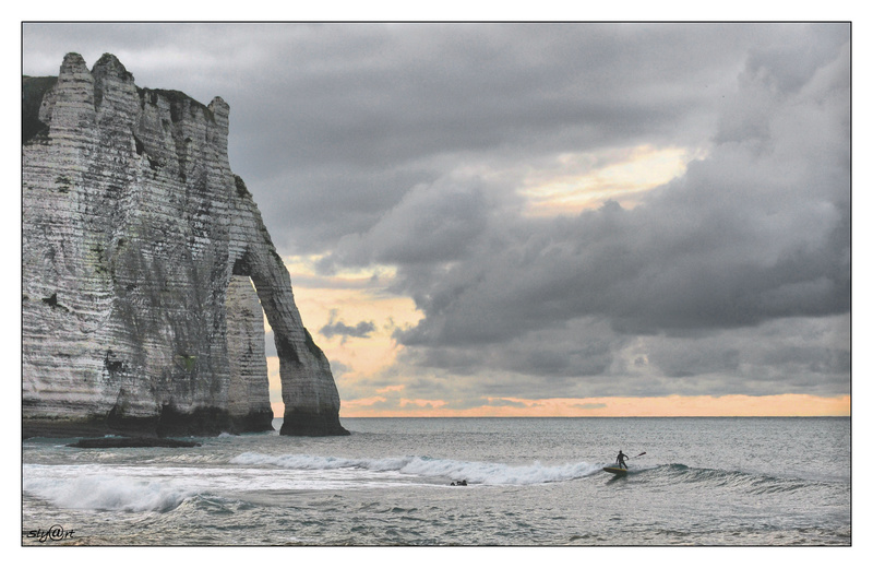 L'original était tristounet alors j'ai rehaussé un peu les couleurs pour mettre en évidence la partie orange du ciel.C'est vrai que je n'avais pas le meilleur angle de vue sur l'arche mais ce surfeur était là alors ...