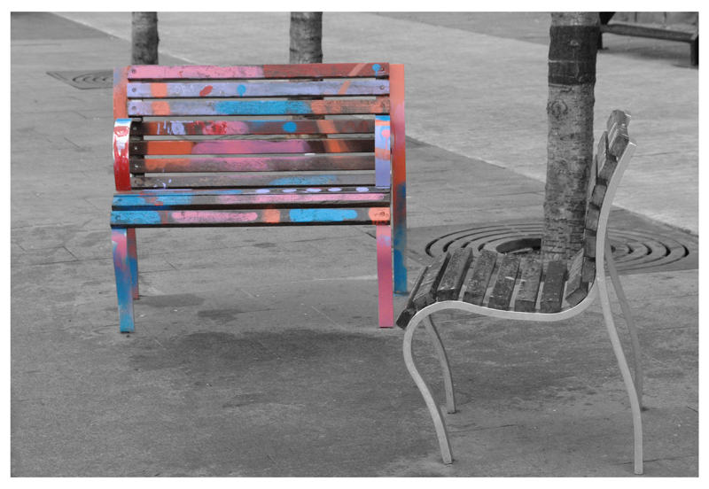 La chaise - au premier plan - se confond avec la plaque mais également l'arbre.De plus,la partie du banc en haut à droite sans oublier le rendu des deux troncs derrière la chaise en couleur.