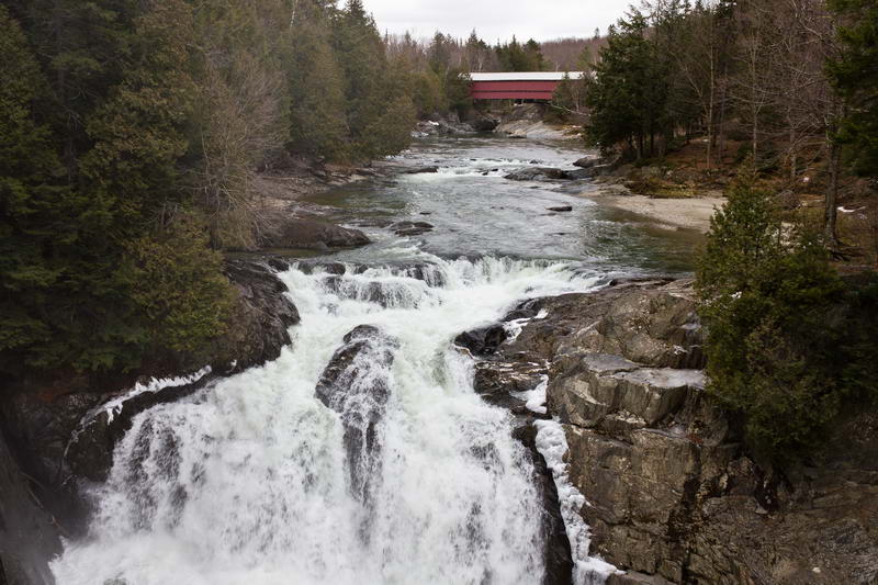 Ce sont des chutes d'ici près de de chez moi plus au sud de Québec. Le pont tout au fond est un pont couvert, l'eau a véritablement cette couleur émeraude.