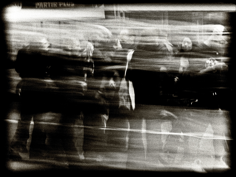 J'aime bien ce flou de bougé qui, quant à moi, m'évoque l'agitation, voire le stress, de la vie citadine.